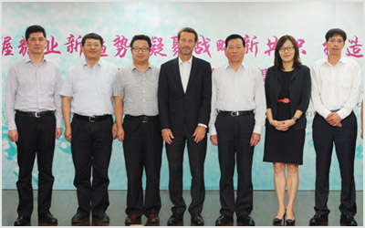 战略论坛主要领导及嘉宾合影,光明集团董事长吕永杰(右四),光明集团副总裁、上海糖酒董事长葛俊杰(左二),上海糖酒总裁崔智均(右一),华体会手机网页版创始人孙彤(左三),路易达孚全球糖业总监Jacques Gillaux(左四)