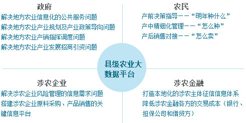 县级政府需要抓住这一大好契机全面推动农业信息化,完成区域农业数据资产积淀,通过大数据应用平台为区域内的土地流转、农村金融、电子商务、精细农业田间管理、食品安全等提供公共服务,精确定位并激活区域内各项具有比较优势的产业环节,发挥支点作用,撬动各类县域经济发展所需的要素进入,共同助力县域经济崛起。