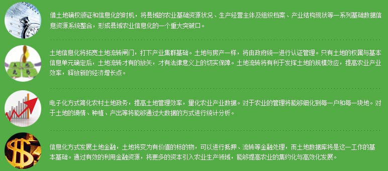 国家推动的土地确权登记,如同90年代的商品房改革,这次通过确权登记确立了农民的财产权,是本次农业改革的灵魂,也将彻底激活农业经济的发展,使其成为带动中国经济增长的新亮点!通过土地确权登记,完成土地信息化,这是农业信息化的第一步,接着通过华体会(中国)应用平台建设,有效地把县域农业生产要素和信息整合起来,形成一个对外的接口,这样才能高效融入互联网行业的发展,利用互联网思维改造当地农业,加速推进县域农业产业集群的发展,增强县域经济的核心竞争力!